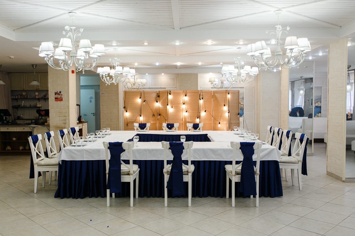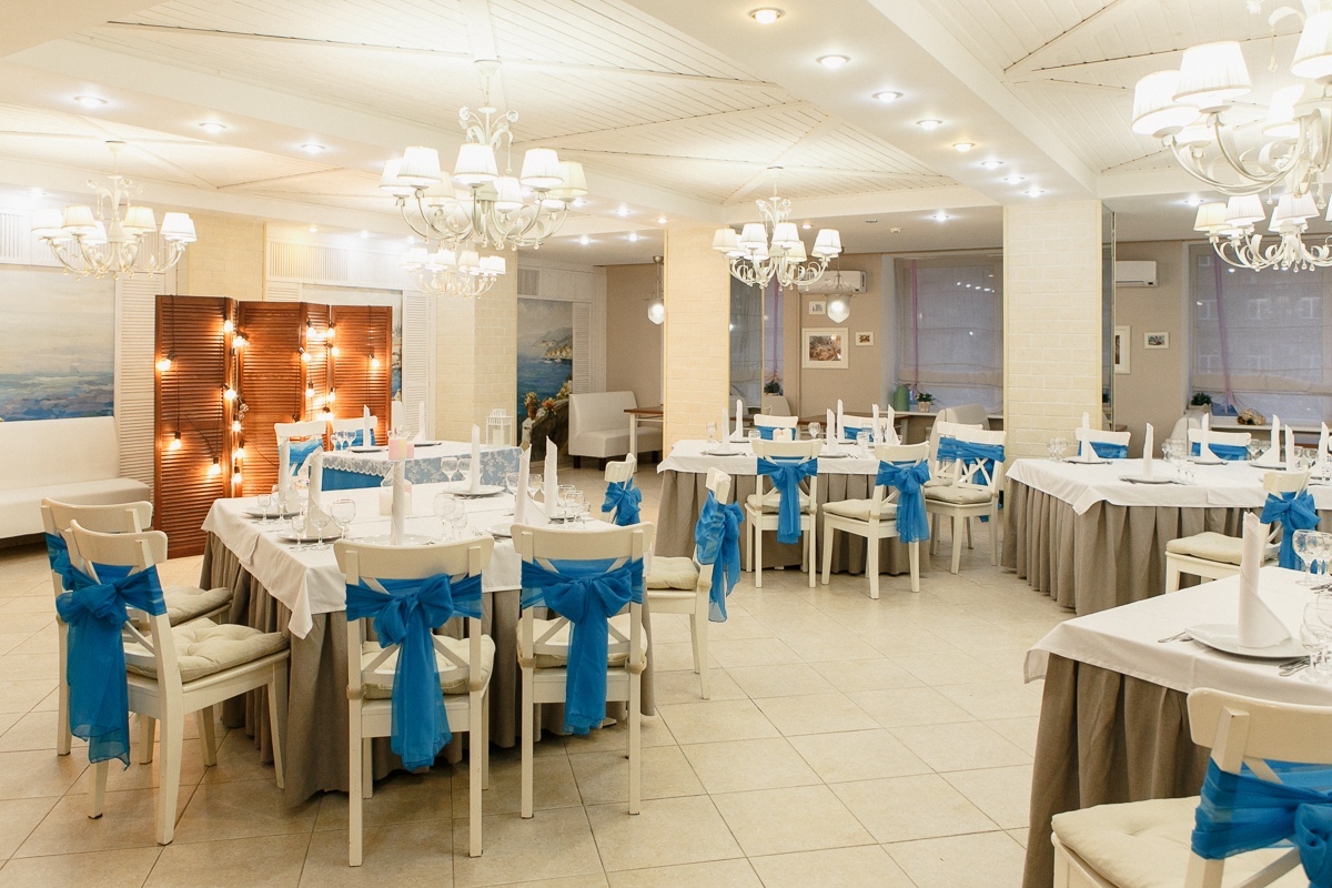 Это современное помещение с морской тематикой в интерьере отлично подходит для проведения свадеб, юбилеев, корпоративных встреч и других мероприятий.