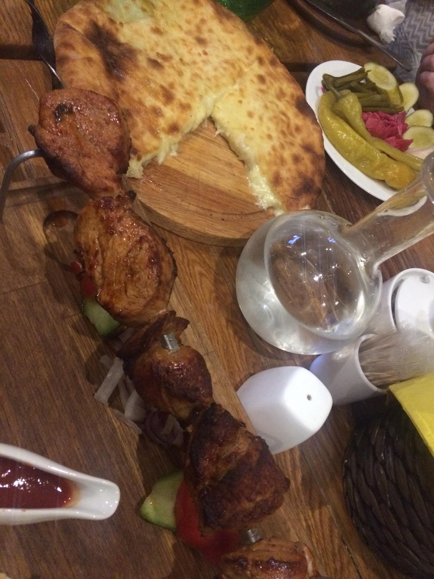 Шашлык готовят при вас на мангале прямо в зале. Вкусно и недорого.