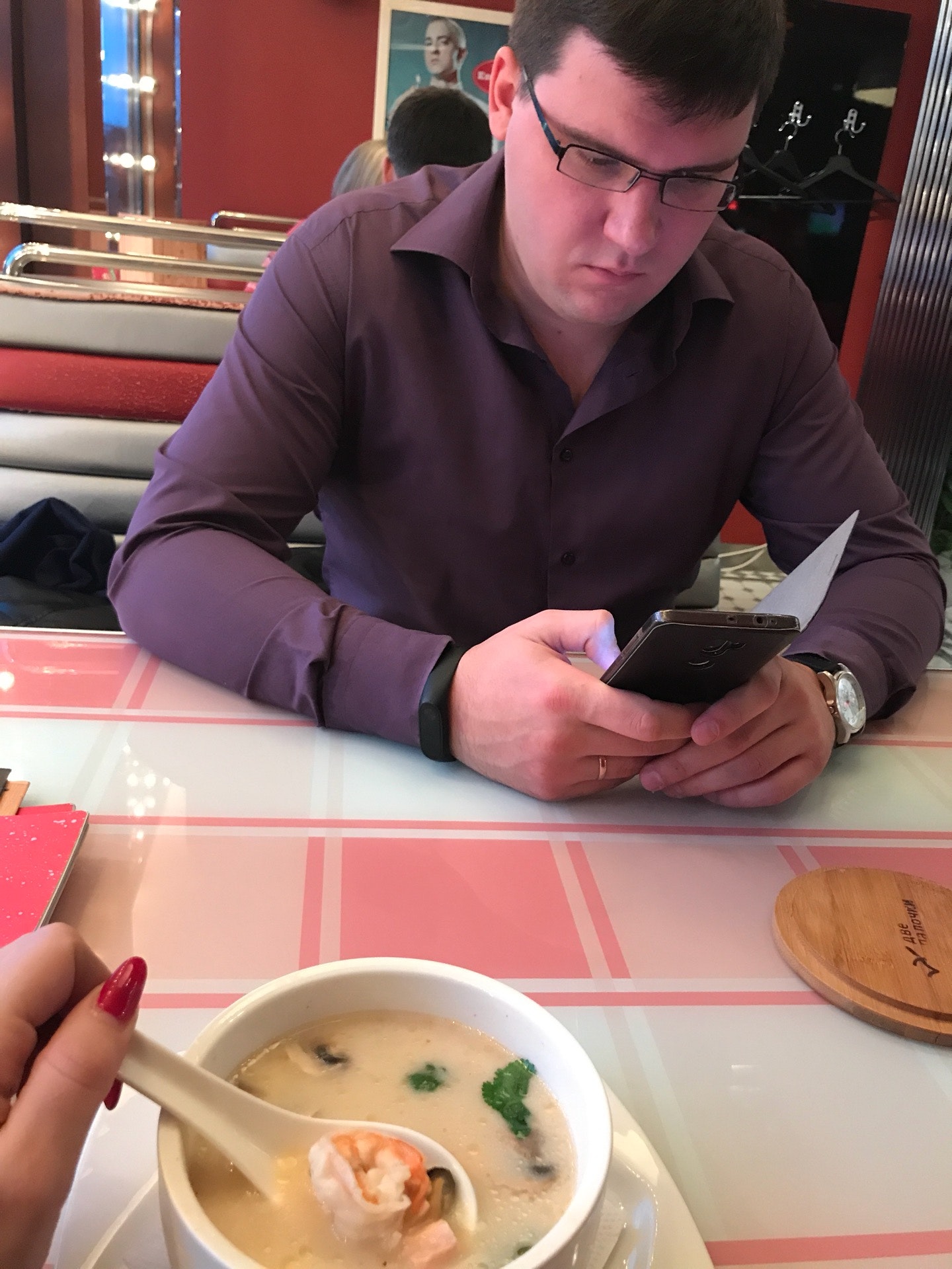 Блюда приносили с разницей в 10 минут в пустом заведение,официантка улыбнулась только после чаевых,блюда за такие деньги обычные, удон просто макароны с курицей,овощи на гриле-полувареные