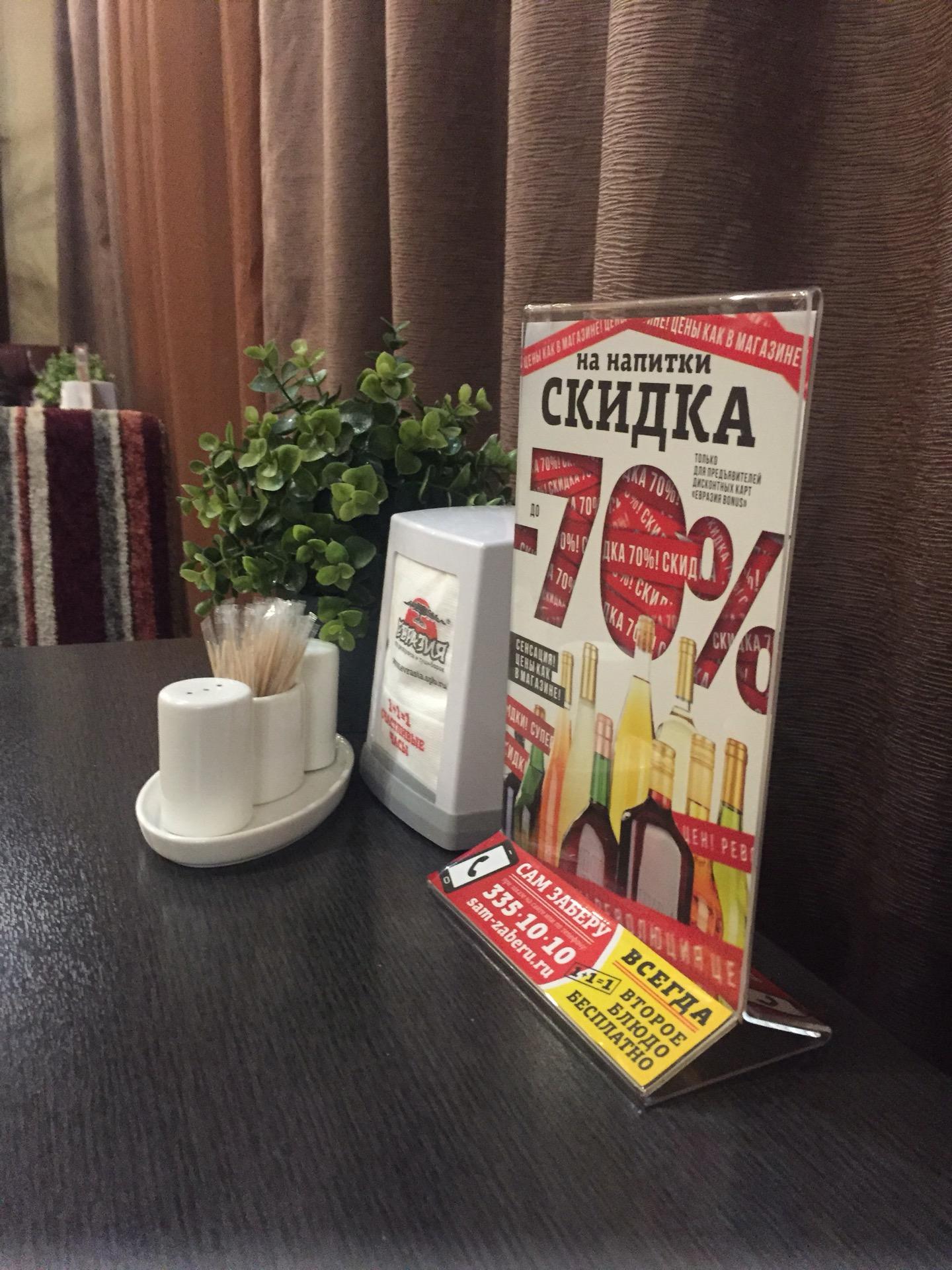 Карта "Евразия Студенческая" предоставляет скидку 25% на все меню и напитки. А с воскресенья по четверг (с открытия до закрытия ресторана) вы получаете каждое второе блюдо бесплатно