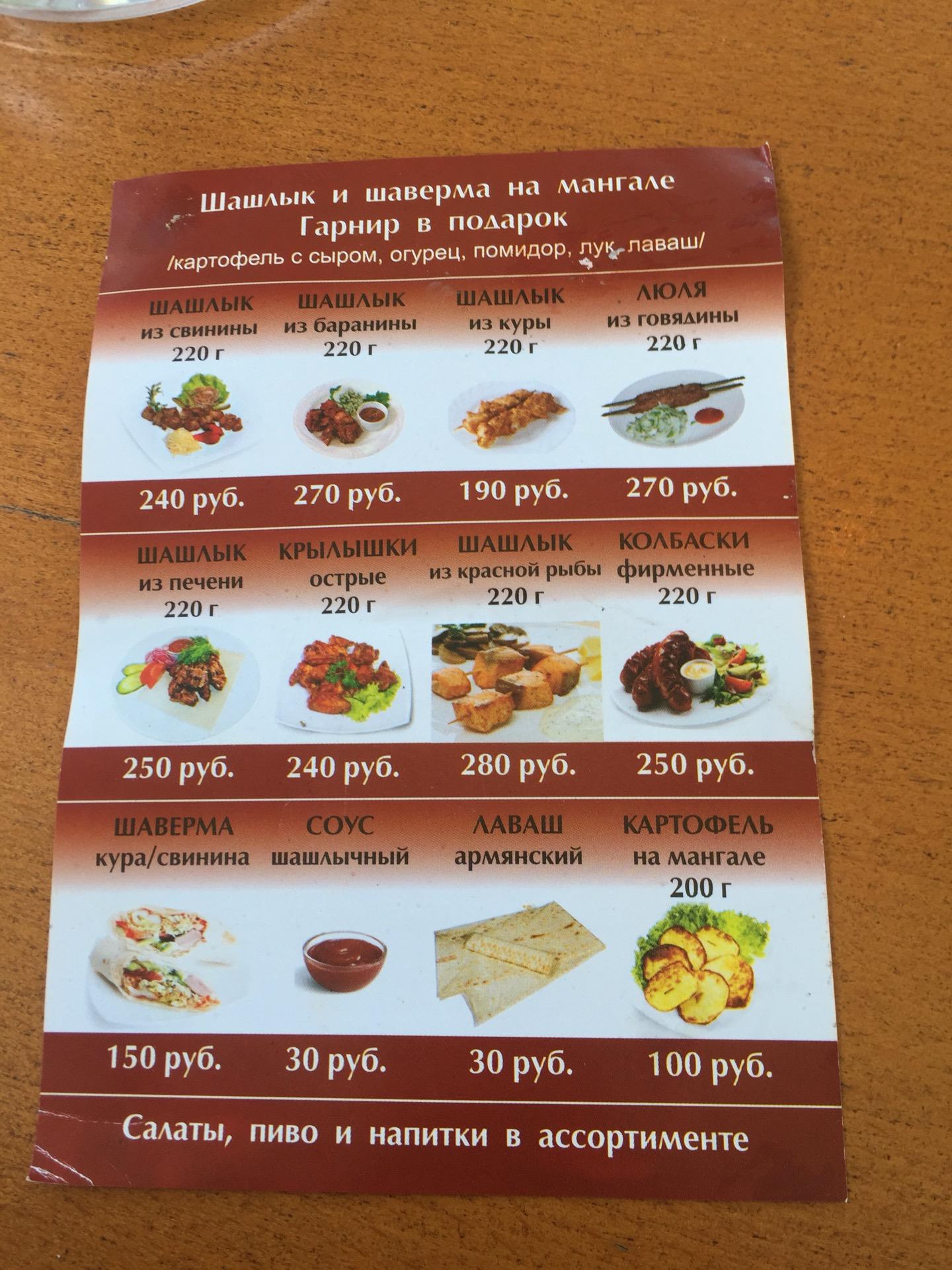 Хуже шашлыка я в жизни не ел. Стухшие помидоры, жесткое засохшее мясо.Начинается все с того, что на вывески смешная цена 190р шашлык свиной, я долго думал , что развод, но повелся , в итоге стоит 270