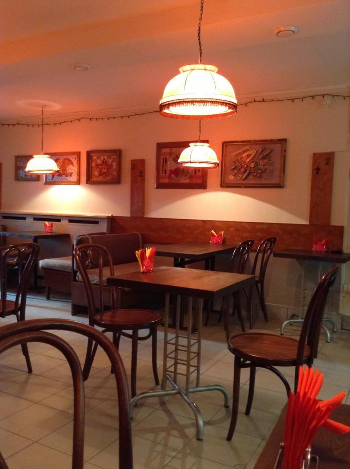 Небольшое кафе, идентифицировать стилевую принадлежность которого достаточно сложно. Вроде бы элементы декора от хипстерской кофейни, но публика явно из тех, кому за 40 и кто просто пришёл пожрать.