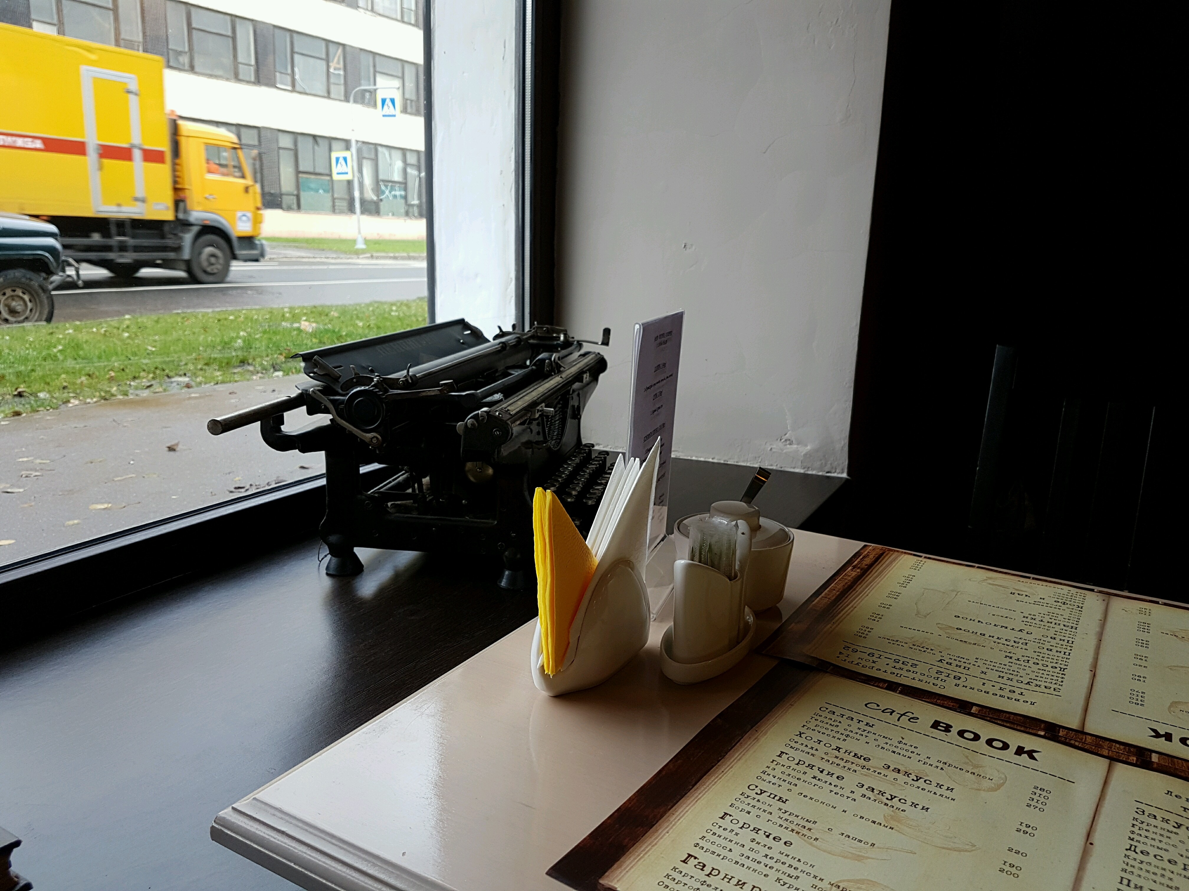 Кафе Book расположено в Петроградском районе города, в здании гостиницы «Алфавит». Заведение в стиле книжного салона начала XX века. Здесь вас ждет приятный интерьер, лаконичная мебель, множество книг, раритетная печатная машинка, приветливый персонал и по-домашнему вкусная еда.