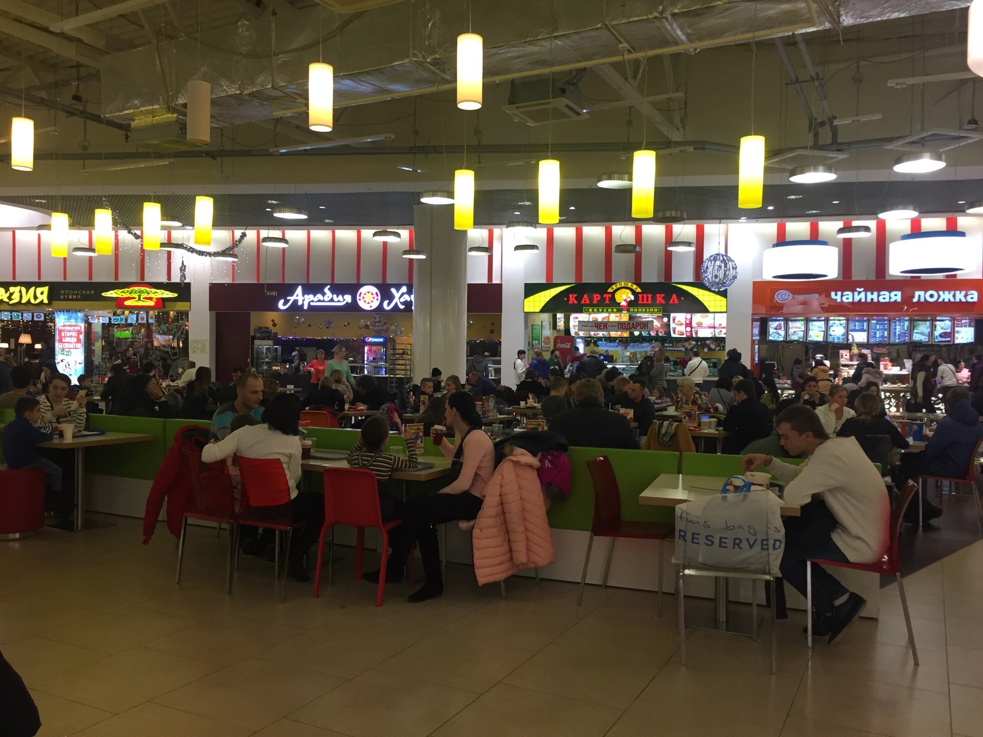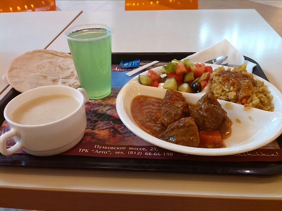 Весьма адекватная еда для ресторанного дворика, похожа на настоящую). Вкусная баранина, в кофе есть сахар (а не просили).