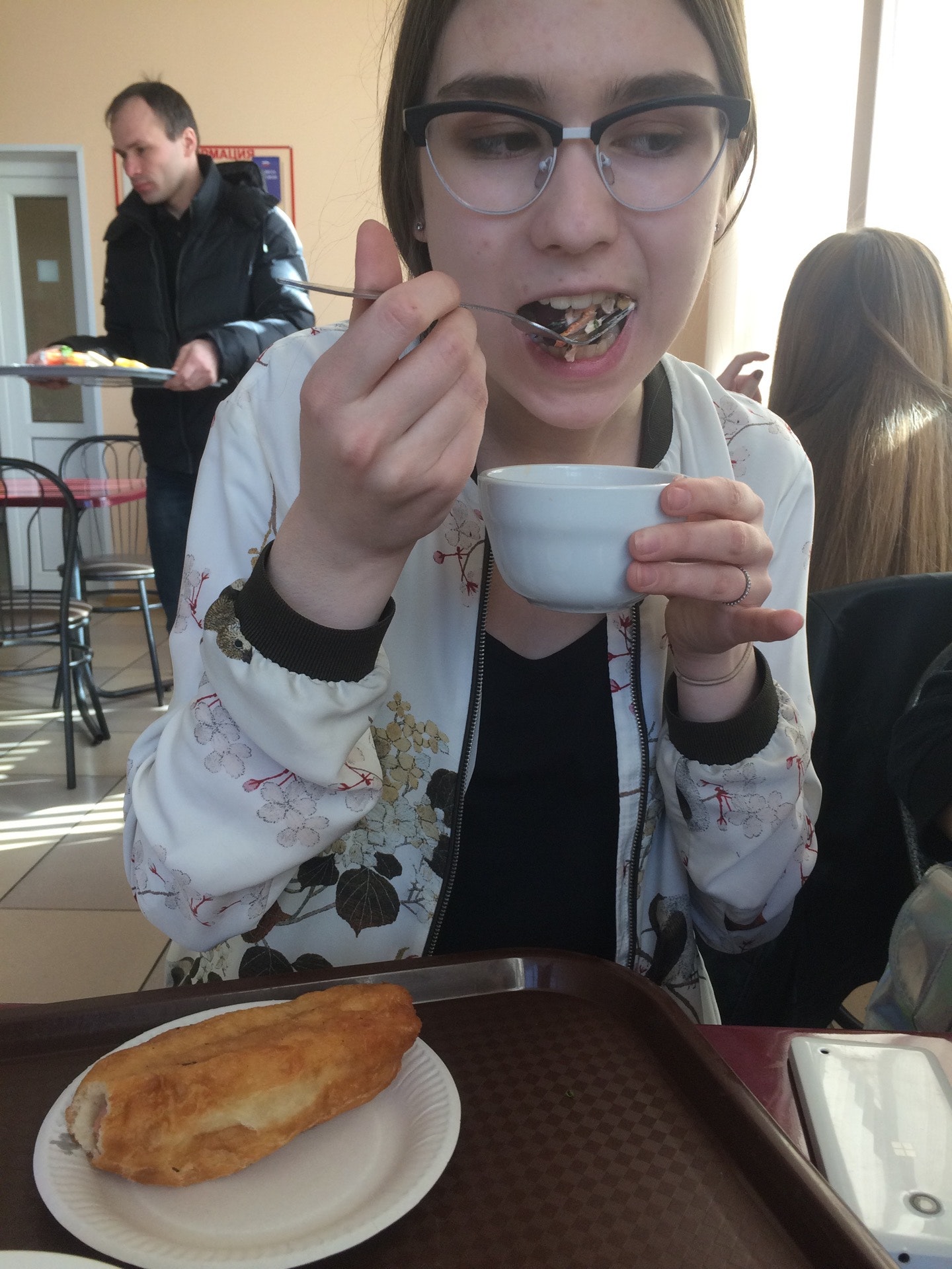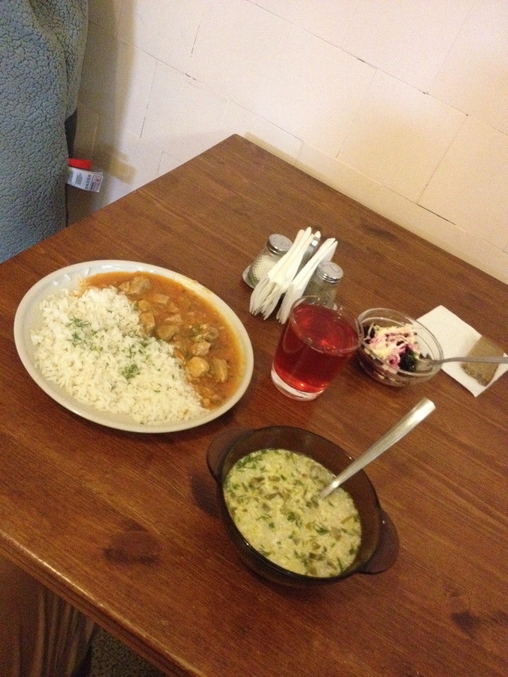 Еда столовская, но вполне приемлемая. По цене не сказать что бы дёшево. Первое, второе, салат и компот в 250 рублей. В округе есть лучше. Плюс - очереди в обед маленькие.