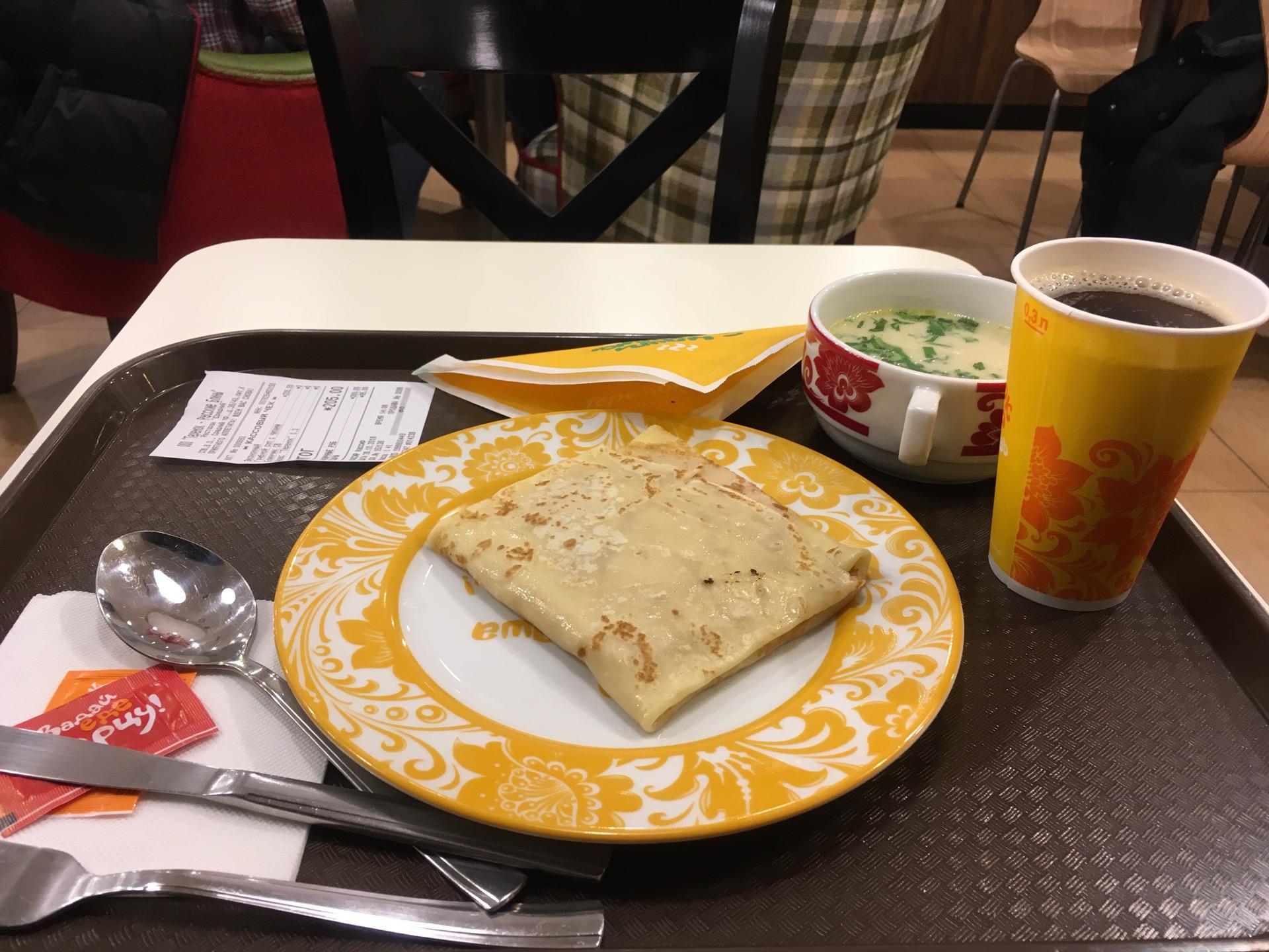Вкусный и сытный блин с рубленым мясом "добрыня никитич", а в кафетерии потрясающее пирожное-картошка.